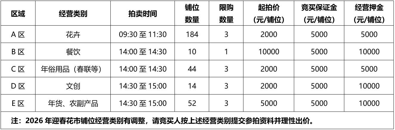 3、E区(年货、农副产品)的竞买人,必须是依法设立并有效存续的企业法人或个体工商户,不接受个人参拍,必须提供有效的营业执照,食品经营许可证或符合规定的备案凭证、从业人员健康证、花市经营产品实拍图片(详见《2026年罗湖区迎春花市铺位使用权竞买须知》E区经营要求)。